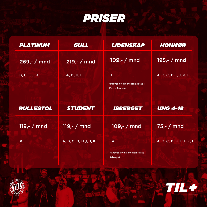 TIL+ sesongkortabonnement har tre ulike fordelskategorier: Platinum, Gull og Lidenskap. Her finner du en oversikt over fordelene.