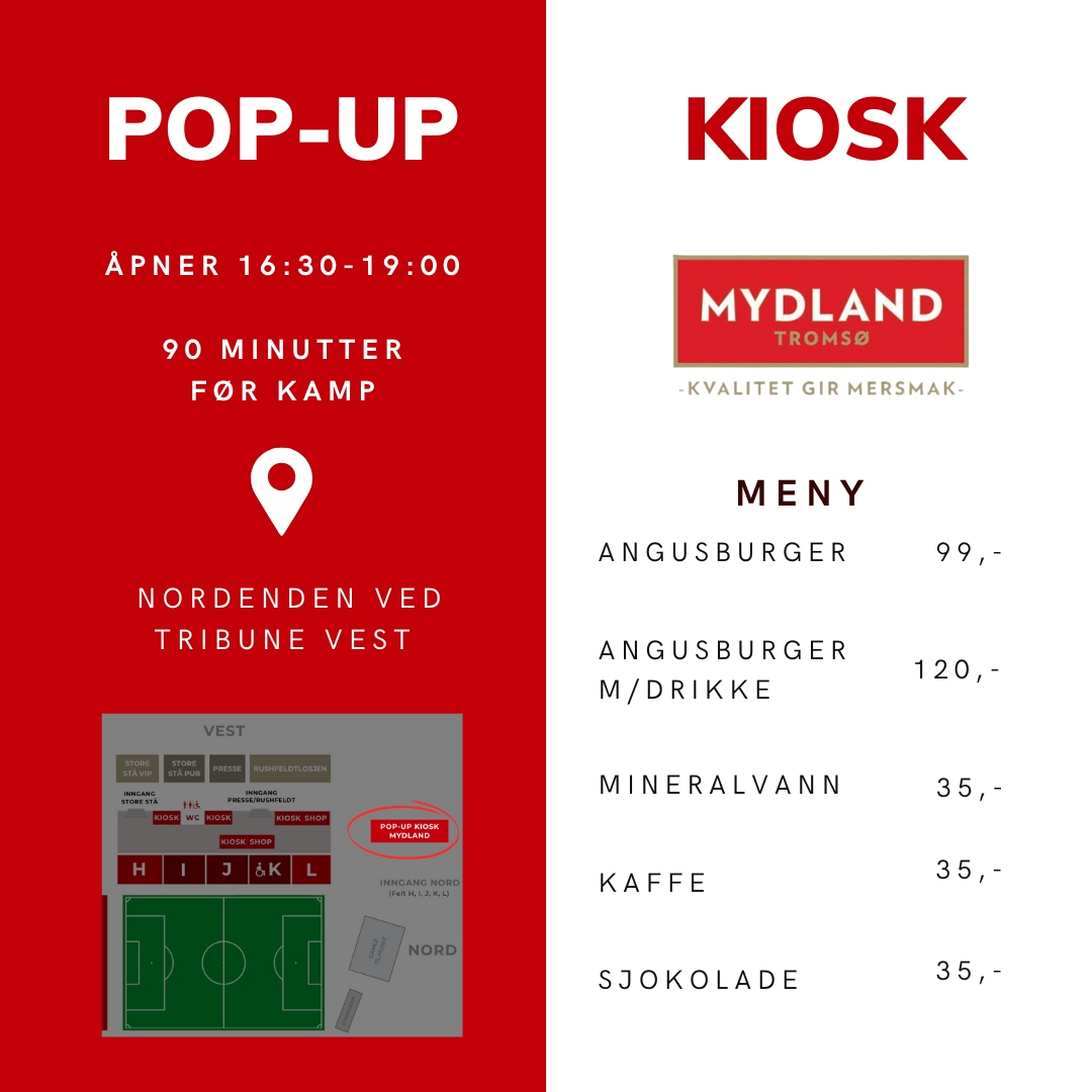 - Mydland stiller med pop-up kiosk og grilling utenfor tribune vest.