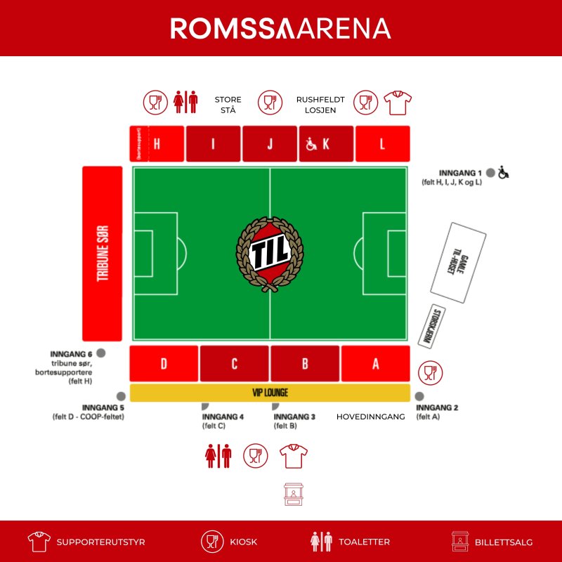 - Rødt og hvitt skjerf, drakt og annet TIL-merch kan du kjøpe både i inngangen til tribune vest og utenfor Cooptribunen. Eller på shop.til.no, men da kan vi ikke garantere at du har det til kampen.