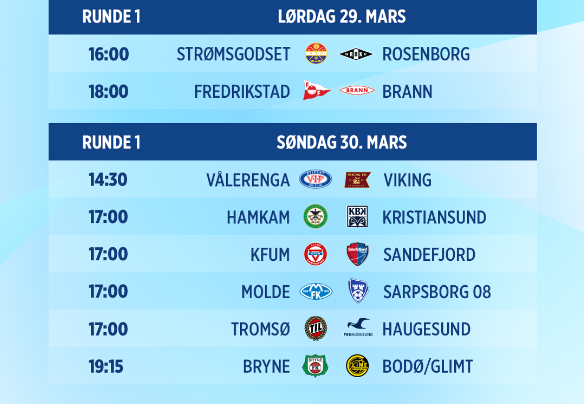 | Bryne | - | Bodø/Glimt | Søndag | 19.15 |
