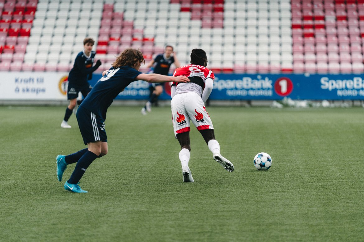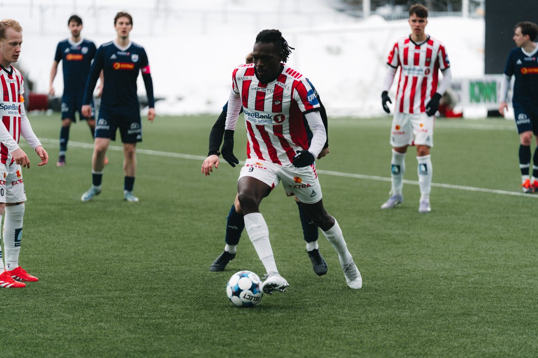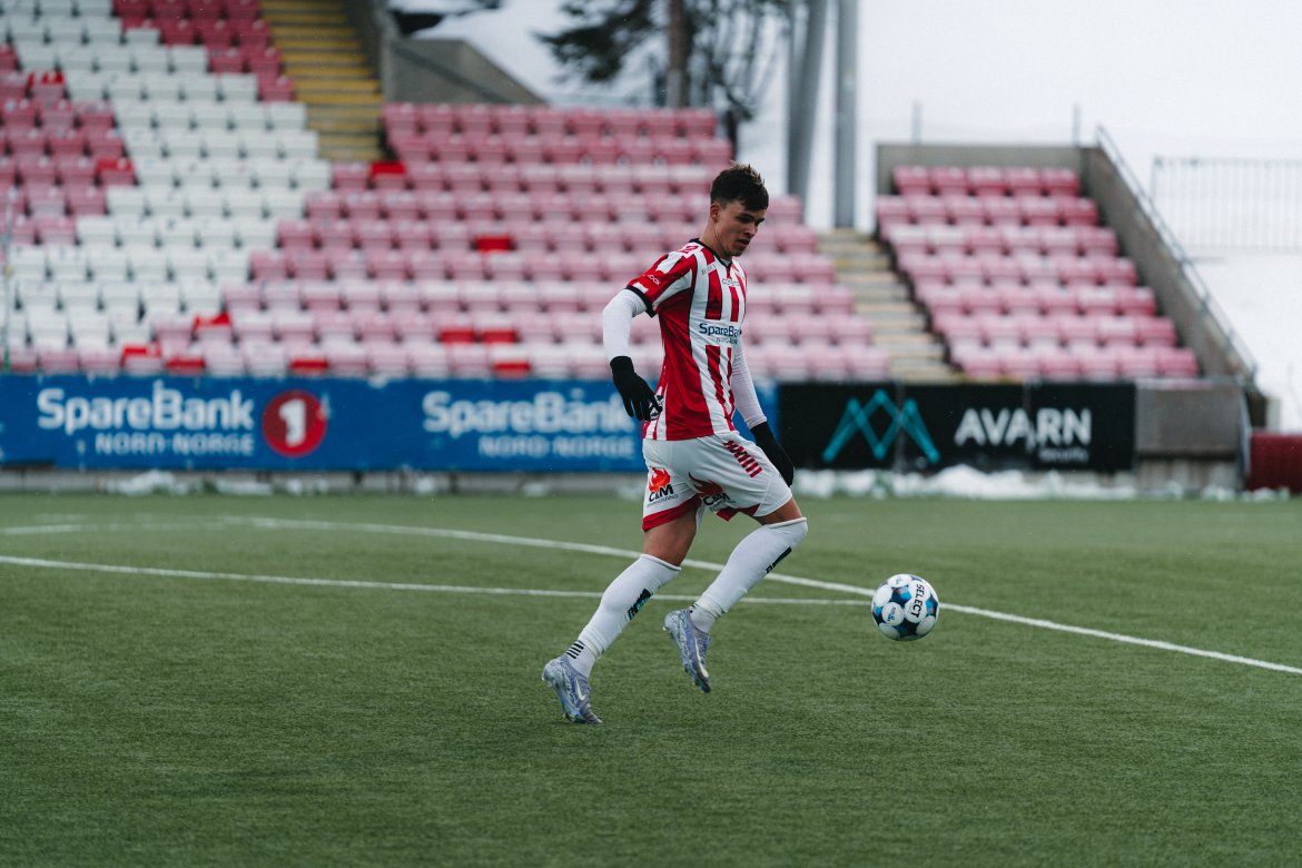 Det sparkes i gang på Romssa Arena og etter kun 6 minutter får Robertsen kampens første sjanse for bortelaget.