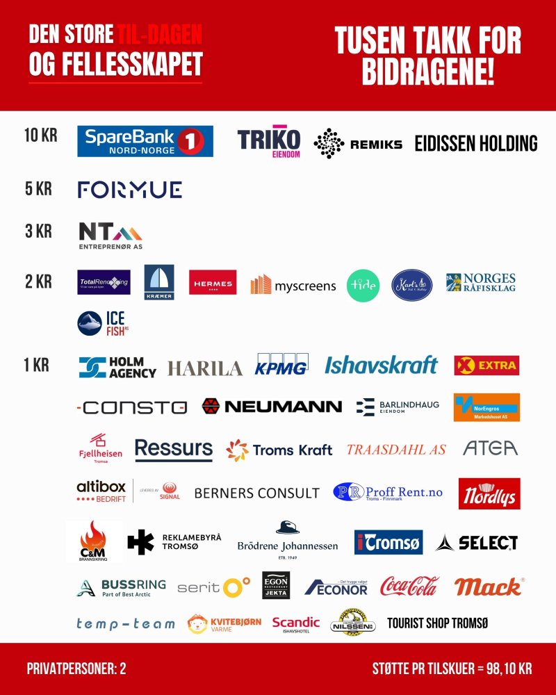 Minste beløp for privatpersoner pr tilskuer er 5 øre pr tilskuer, og maksimalt bidrag ved et utsolgt Romssa Arena er da 335 kr.