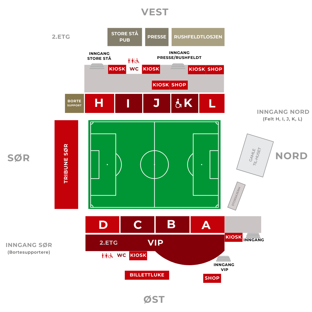 - Du kan kjøpe supporterutstyr utenfor Cooptribunen på østsiden av stadion, samt. inne på tribune vest.