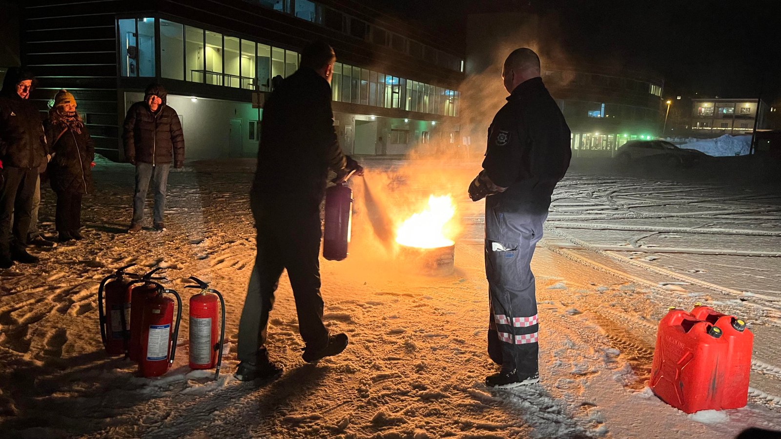 Ute på parkeringsplassen ble det rigget til brannøvelse hvor man fikk prøvd å slukke brann med ulike apparater.